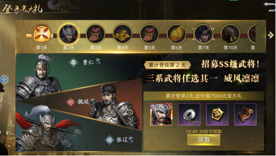 第二天:领取ss武将三系武将任选其一、银币*50万、军令*10、中级经验书*10
