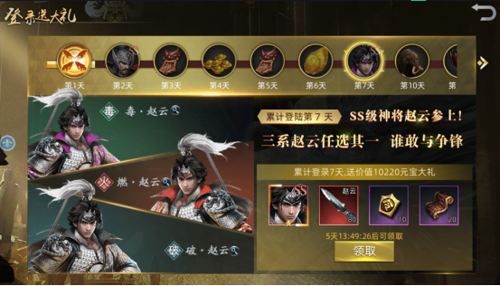 第七天:ss级三系赵云任选其一、赵云专属神器涯角枪*80、军令*10、中级经验书*20