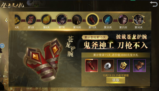 第十五天:苍龙护腕*1、银两*100万、军令*10、中级经验书*30