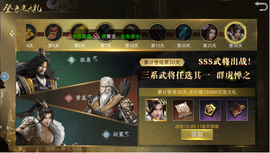 第三十天:三系sss武将任选其一、技能残页*10000、军令*10、中级经验书*30